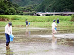 子どもたちに「四万十川自然再生事業(ツルの里づくり)」の実施によって、中山地区ではメダカや水生昆虫などの生き物が多数確認され、ツルの越冬にふさわしい湿地環境になりつつあることを伝えました。その後、全員でえさ場にモミを撒きました。なお、江ノ村地区については、雨天のため急遽中止し、後日、会員によるモミ撒きを行いました。 |