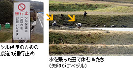 | 頻繁にツルが確認されるようになったため、ツルを見かけた場合の諸注意を啓発するチラシと看板を制作しました。11月17日には記者発表を行い、メディアを通じて協力を呼びかけました。 |