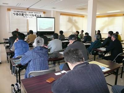 農業振興とツル保護活動の両立が図られている八代地区の活動には学ぶべきところがたくさんあります。地域から集まった約40名の参加者は真剣に耳を傾けていました。