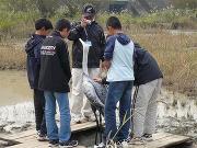 また、ツルの越冬を目指して製作されたデコイ(ツルを呼び寄せるための模型)やえさ場・ねぐらの整備状況の見学、周辺で捕れた水生生物のえさ場への放流などを行いました。中山地区では実際にデコイを設置する状況も見学しました。