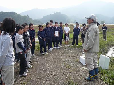 参加した四万十市立中筋小学校と東中筋中学校の子どもたちは、現地で国土交通省中村河川国道事務所の四万十川自然再生事業「ツルの里づくり」や、澤田佳長氏(野生生物環境研究センター 所長)によるツルの飛来状況、生態等の説明を受けました。