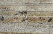 そこで当会では、中筋川流域の農道などへモミや雑穀などの餌を撒き、ツルが食糧危機に陥らないようにサポートしました。ツルは警戒心が非常に強いため、初めのうちは撒いた餌を食べようとはしませんでした。しかし、地道に給餌活動を続けた結果、2週間ほどして警戒心の薄い幼鳥が餌をついばみ始めました。そしてその後、成鳥も食べるようになりました。