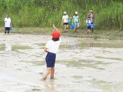 モミ撒きは、中村河川国道事務所が四万十川自然再生事業「ツルの里づくり事業」で整備している中山地区の湿地約0.3haで行いました。子どもたちは足が土に埋まって歩きにくい湿地の中で、懸命に手を振り上げてモミ約40kgを撒きました。モミは順調に生育すれば10月下旬頃までには実り、秋から冬に飛来するツルの餌となることが期待されています。
