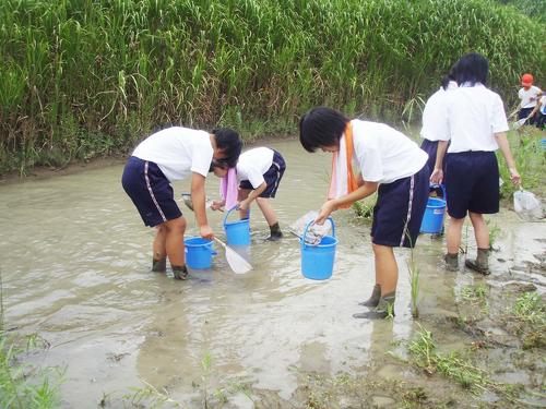 このほか、同地区では湿地環境(タマリ)創出の取り組みも行われており、そこにすむ水生生物の観察も行いました。子どもたちは石の隙間や草の根元などに網を入れ、メダカや川エビなどたくさんの生き物を捕まえていました。