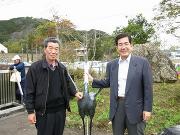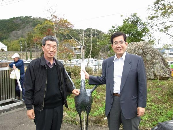 下:ツルのデコイを囲んでパチリ!多和博嗣会長と田中全四万十市長 |