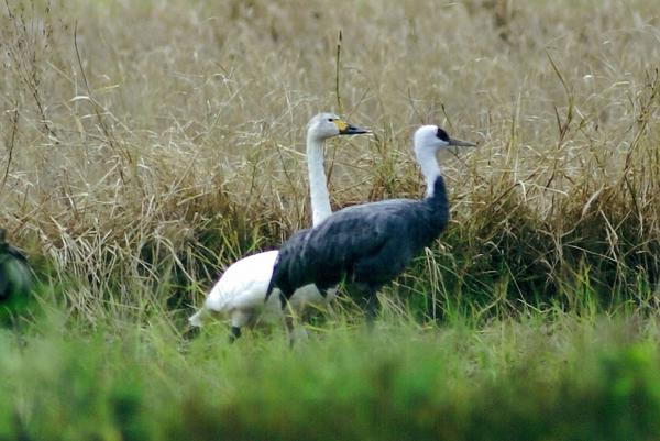 下:ナベヅル(右)とコハクチョウの貴重なツーショット