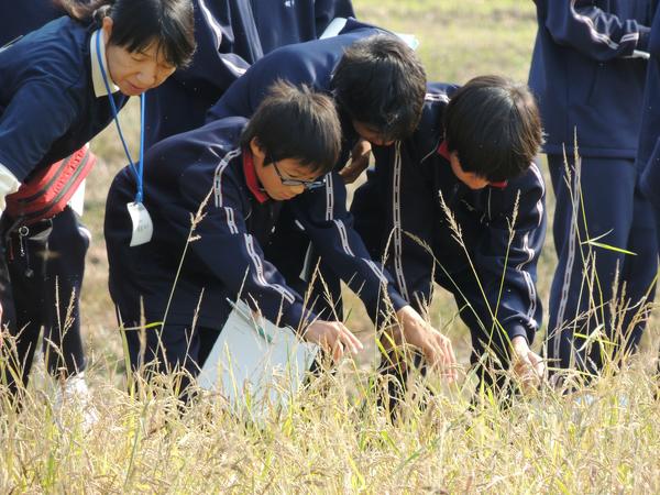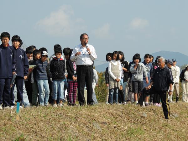 子どもたちは、はじめに夏の学習会(7月)の際にモミ撒きや苗植えを行った中山地区の湿地を訪れ、ツルの餌となる稲の実り具合を確認しました。そして、鳥類の専門家である澤田佳長氏(野生生物環境研究センター所長)から、今季初めて飛来したツルの行動などについて説明を受けました。