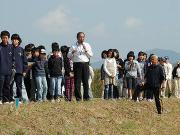 その後、当会が中心となって越冬地整備を行っている江ノ村地区に移動して、ツルを呼び寄せるための模型「デコイ」の設置作業を手伝い、普段間近で観察することのできないツルの大きさや体の特徴などを体感。また、整備箇所周辺で休耕田を水田に戻し有機農業を実践している福留壮氏による、ツル保護活動と農業との密接な関係についての話に耳を傾けました。福留氏は、農薬等が水生生物に蓄積され食物連鎖でツルや人間などに害を及ぼす可能性について触れ、人間の活動(農業等)と生き物が共存できることが重要であると語ってくれました。
