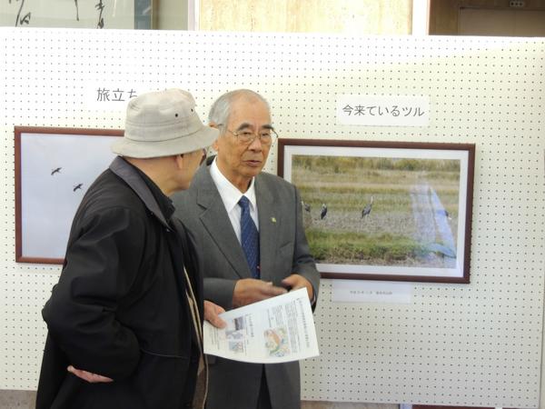 中:来場者に長年のツル保護のあゆみについて説明する澤田先生(右)