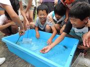 その後、実際に現地に移動し、湿地を見ながら中村河川国道事務所から「ツルの里づくり」の経緯や湿地の特色などについての説明を受けました。また、湿地に生息する水生生物に触れながら、地元で魚類の研究をしている東健作さんから、ツルが雑食性であることや絶滅が危惧されているメダカもいる豊かな環境が創出されていることを学びました。