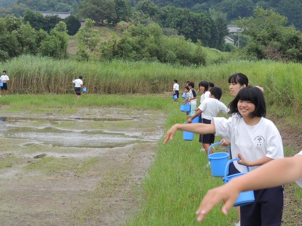 最後に、実りの秋にツルの餌となることを願い、畦から湿地の中に勢いよくモミを撒きました。澤田先生から「つがいで訪れたツルはその場所を気に入ると、翌年家族連れで来る」という話を聞いていた子どもたちは、この日訪れていた多くの取材陣に対し、「昨年より一羽でも多くツルが来て、越冬してくれると嬉しい」としっかりとした頼もしい口調で話していました。