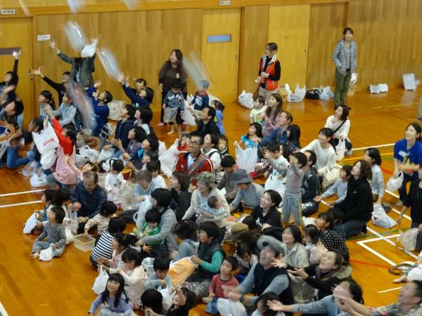 締めくくりに行われた恒例の「もち・菓子投げ」で盛り上がりは最高潮に達し、集まった人たちは袋一杯のお餅やお菓子を手に笑顔で会場を後にしました。