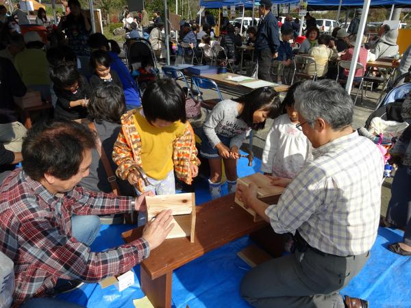 指導者が付いて行うので、子どもや初心者でも安心して巣箱作りが楽しめました。ミサゴなど中筋川流域で確認されている鳥類の紹介コーナーも併設されました。(協力:国土交通省中筋川総合開発工事事務所)
