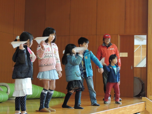 子どもたちは折ったばかりの紙飛行機を飛ばして、飛距離や滞空時間を競いました。