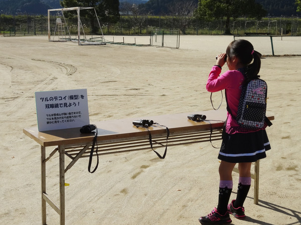 ツル類の観察は遠くから双眼鏡で行うということを知っていただくため、デコイを遠くに設置し、双眼鏡で見てもらいました。