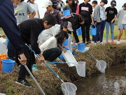 そして、子どもたちはその効果を確かめるため、タモ網で水路をガサガサ、ガサガサ…。すると、川と海を行き来しながら生活するシマヨシノボリやテナガエビ類がたくさんタモ網に入りました。ツルは二番穂の他に小魚やエビなども食べます。事業によって水田脇の用水路まで魚が上れるようになり、江ノ村箇所にツルのえさとなる生き物がいることがわかりました。