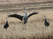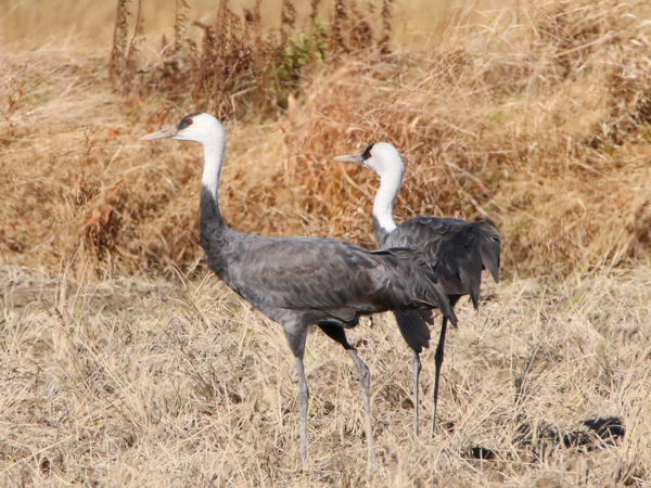 上:3羽のグループ(真ん中で羽ばたいているのがナベクロヅル)