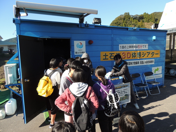 国土交通省中村河川国道事務所の協力により、近年多発しているゲリラ豪雨や土石流などを体験できる車両に乗り込んで、災害に対する知識や心構えを学んでもらいました。