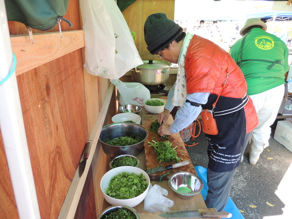 四万十川自然再生協議会のメンバーが四万十川河畔で摘んできた野草と、当会が越冬地として再生した江ノ村の田んぼのお米を使用して作った野草がゆを試食して頂きました。