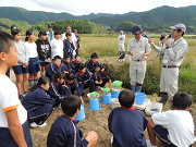 続いて、国土交通省の方から、「四万十川自然再生事業(ツルの里づくり事業)」で中筋川と樋門の間の段差をなくし、樋門の中をツルのえさとなる小魚(カワムツ、オイカワ等)などが通ることができるという説明を受けました。また、生き物の専門家の方から、実際に水田脇の水路には、小魚や川と海を行き来しながら生活するミゾレヌマエビ、モクズガニなどがたくさん生息しており、良好な環境になっていることを学びました。