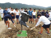子どもたちは、はじめに、二番穂が実る江ノ村箇所の水田を訪れ、当会の会員有志で草を刈り、地元の方と協働で耕作と管理を続けたことにより、荒廃した休耕田が今のような環境の水田に復元されたことを聞きました。そして、ツルを呼び寄せるための模型「デコイ」の足下に土をかぶせ、えさ場・ねぐらづくりの作業を完了させました。