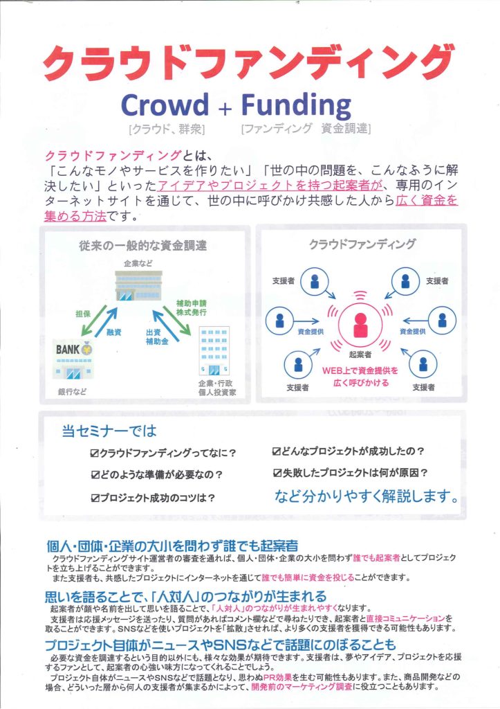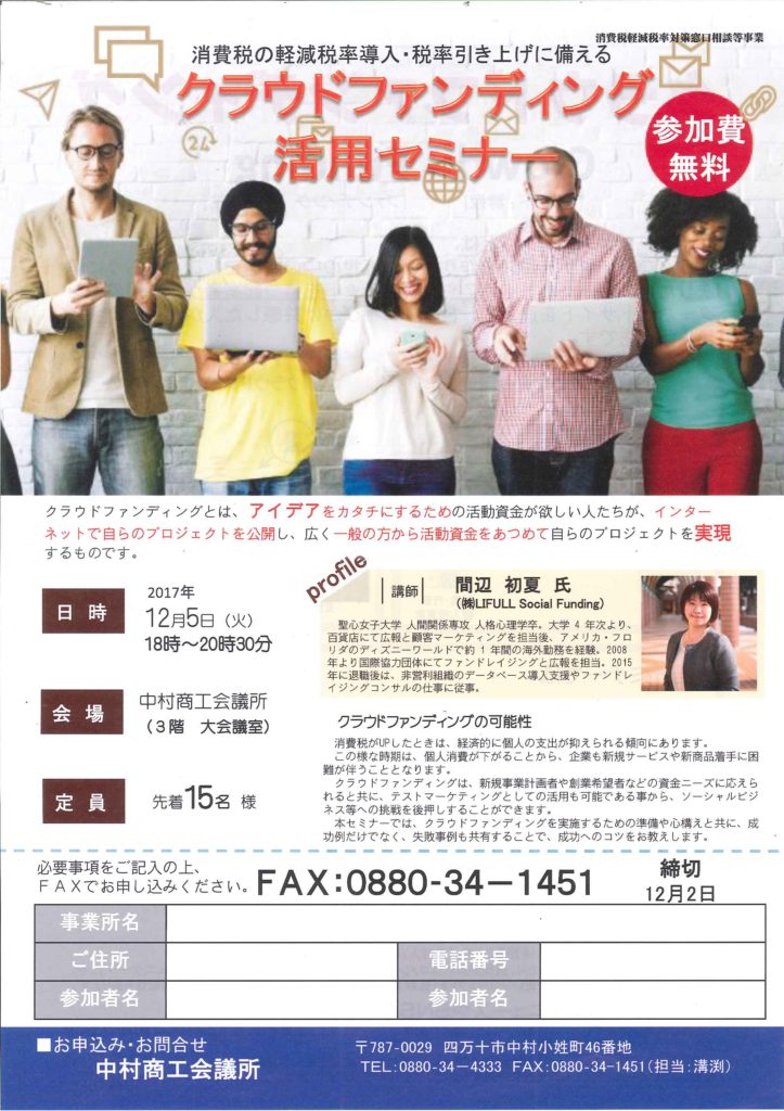 平成29年12月5日(火)、中村商工会議所にてクラウドファンディング活用セミナーを開催します。本セミナーでは、クラウドファンディングを実施するための準備や心構えと共に、成功例だけでなく失敗事例を共有することで、成功へのコツ等を講師を招きお教えします。ご興味ある方は中村商工会議所までご連絡よろしくお願いいたします。