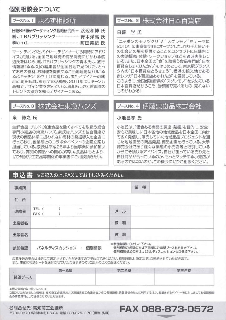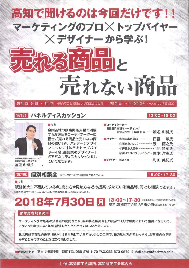 マーケティングのプロ×トップバイヤー×デザイナーから学ぶ!「売れる商品と売れない商品」と題して、今年も7月30日(月)高知商工会館にてトップバイヤーによるパネルディスカッション、個別相談会が開催されます。ご興味ある方はぜひ中村商工会議所までお問い合わせください。
