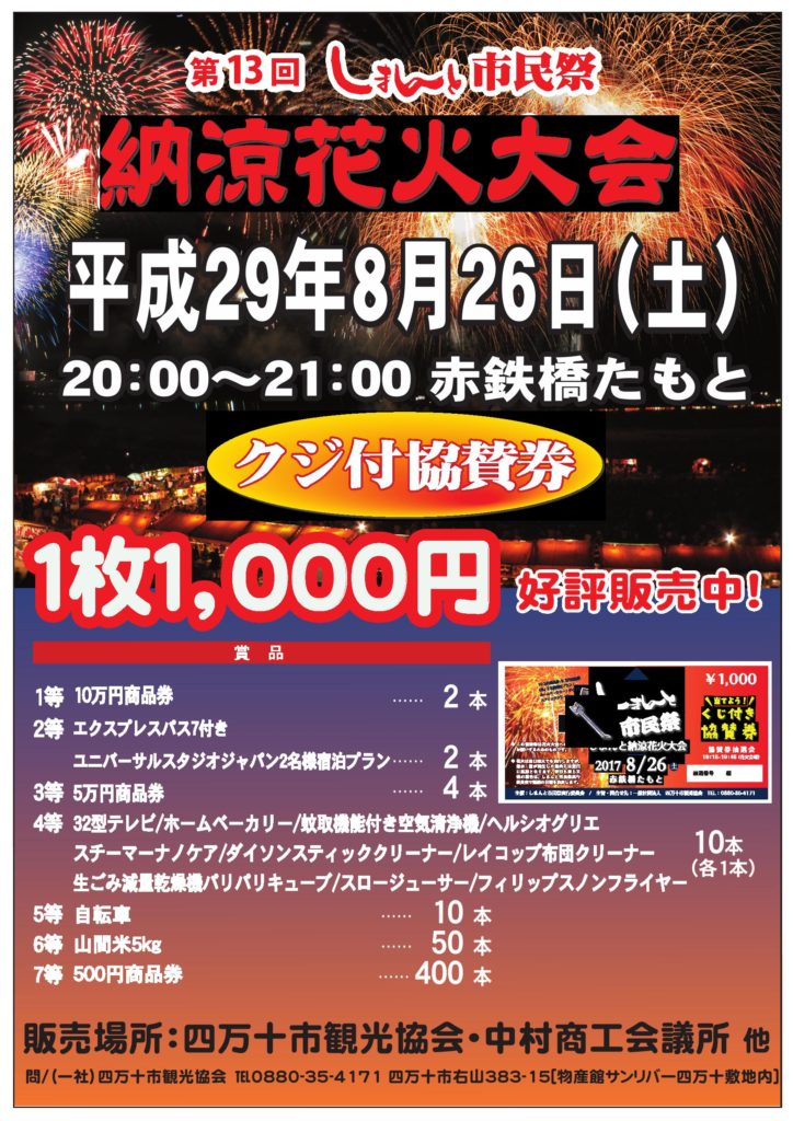 豪華賞品が当たる「第13回 しまんと市民祭 納涼花火大会」のクジ付き協賛券を絶賛発売中です!